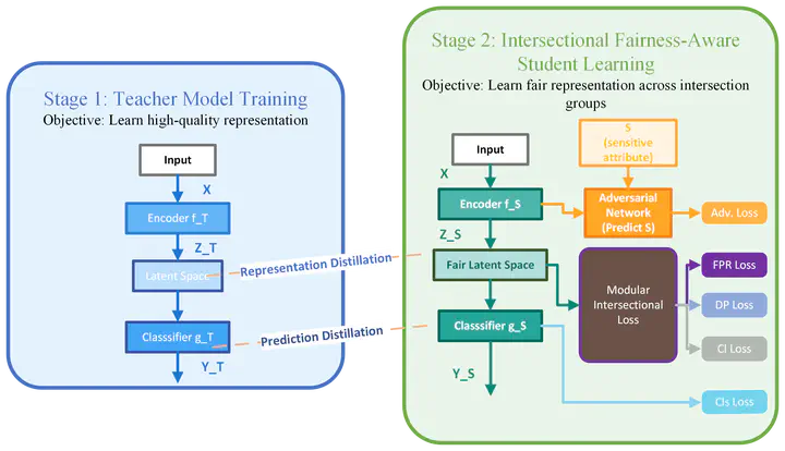 As Artificial Intelligence-driven decision-making systems become increasingly popular, ensuring fairness in their outcomes has emerged as a critical and urgent challenge. AI models, often trained on open-source datasets embedded with human and systemic biases, risk producing decisions that disadvantage certain demographics. This challenge intensifies when multiple sensitive attributes interact, leading to intersectional bias, a compounded and uniquely complex form of unfairness. Over the years, various methods have been proposed to address bias at the data and model levels. However, mitigating intersectional bias in decision-making remains an under-explored challenge. Motivated by this gap, we propose a novel framework that leverages knowledge distillation to promote intersectional fairness. Our approach proceeds in two stages: first, a teacher model is trained solely to maximize predictive accuracy, followed by a student model that inherits the teacher’s representational knowledge while incorporating intersectional fairness constraints. The student model integrates tailored loss functions that enforce parity in false positive rates and demographic distributions across intersectional groups, alongside an adversarial objective that minimizes protected attribute information within the learned representation. Empirical evaluation across multiple benchmark datasets demonstrates that we achieve a 52% increase in accuracy for multi-class classification and a 61% reduction in average false positive rate across intersectional groups and outperforms state-of-the-art models. This distillation-based methodology provides a more stable optimization opportunity than direct fairness approaches, resulting in substantially fairer representations, particularly for multiple sensitive attributes and underrepresented demographic intersections.