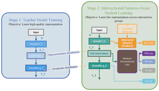 As Artificial Intelligence-driven decision-making systems become increasingly popular, ensuring fairness in their outcomes has emerged as a critical and urgent challenge. AI models, often trained on open-source datasets embedded with human and systemic biases, risk producing decisions that disadvantage certain demographics. This challenge intensifies when multiple sensitive attributes interact, leading to intersectional bias, a compounded and uniquely complex form of unfairness. Over the years, various methods have been proposed to address bias at the data and model levels. However, mitigating intersectional bias in decision-making remains an under-explored challenge. Motivated by this gap, we propose a novel framework that leverages knowledge distillation to promote intersectional fairness. Our approach proceeds in two stages: first, a teacher model is trained solely to maximize predictive accuracy, followed by a student model that inherits the teacher’s representational knowledge while incorporating intersectional fairness constraints. The student model integrates tailored loss functions that enforce parity in false positive rates and demographic distributions across intersectional groups, alongside an adversarial objective that minimizes protected attribute information within the learned representation. Empirical evaluation across multiple benchmark datasets demonstrates that we achieve a 52% increase in accuracy for multi-class classification and a 61% reduction in average false positive rate across intersectional groups and outperforms state-of-the-art models. This distillation-based methodology provides a more stable optimization opportunity than direct fairness approaches, resulting in substantially fairer representations, particularly for multiple sensitive attributes and underrepresented demographic intersections.